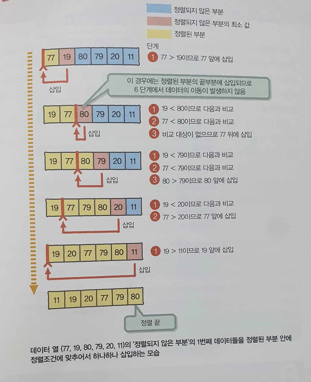 삽입 정렬은 위 배열을 정렬할 때 적절한 위치에 삽입하는 방법으로 문제를 해결합니다.
