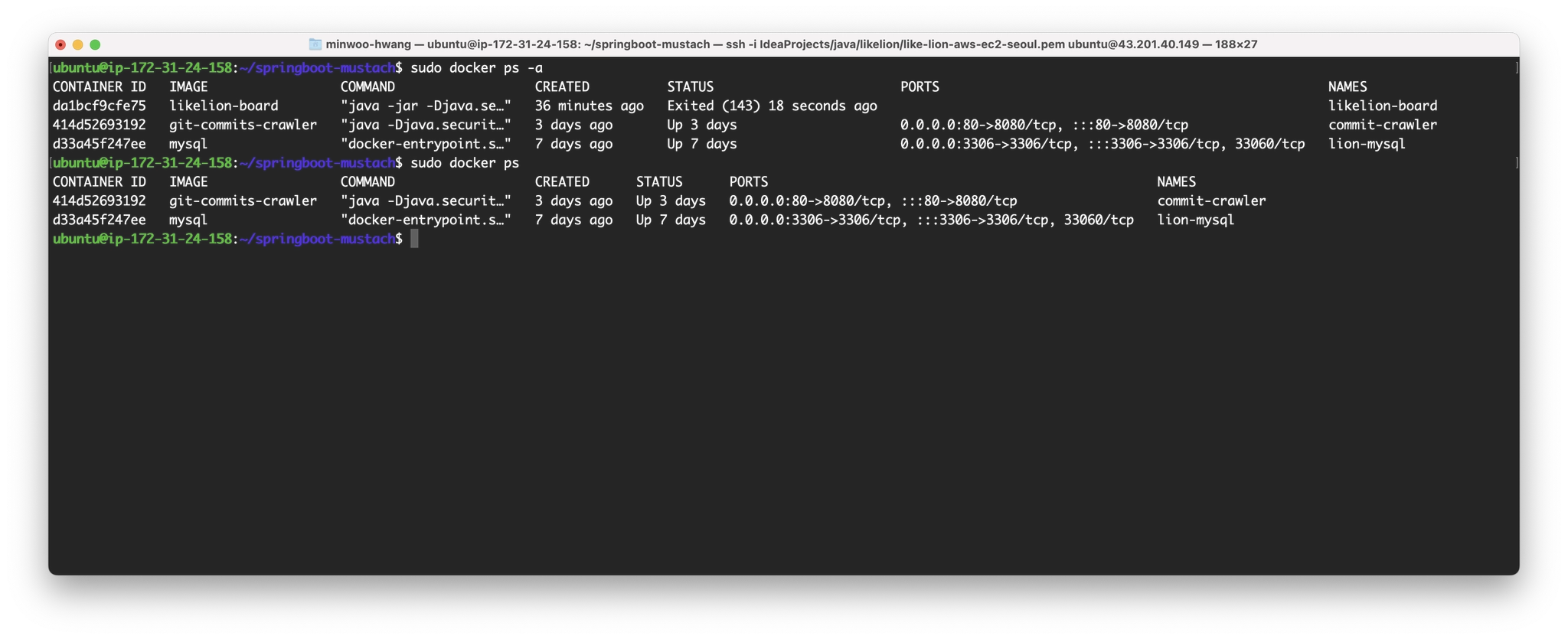 # sudo dokcer ps : 실행중인 프로세스만 출력