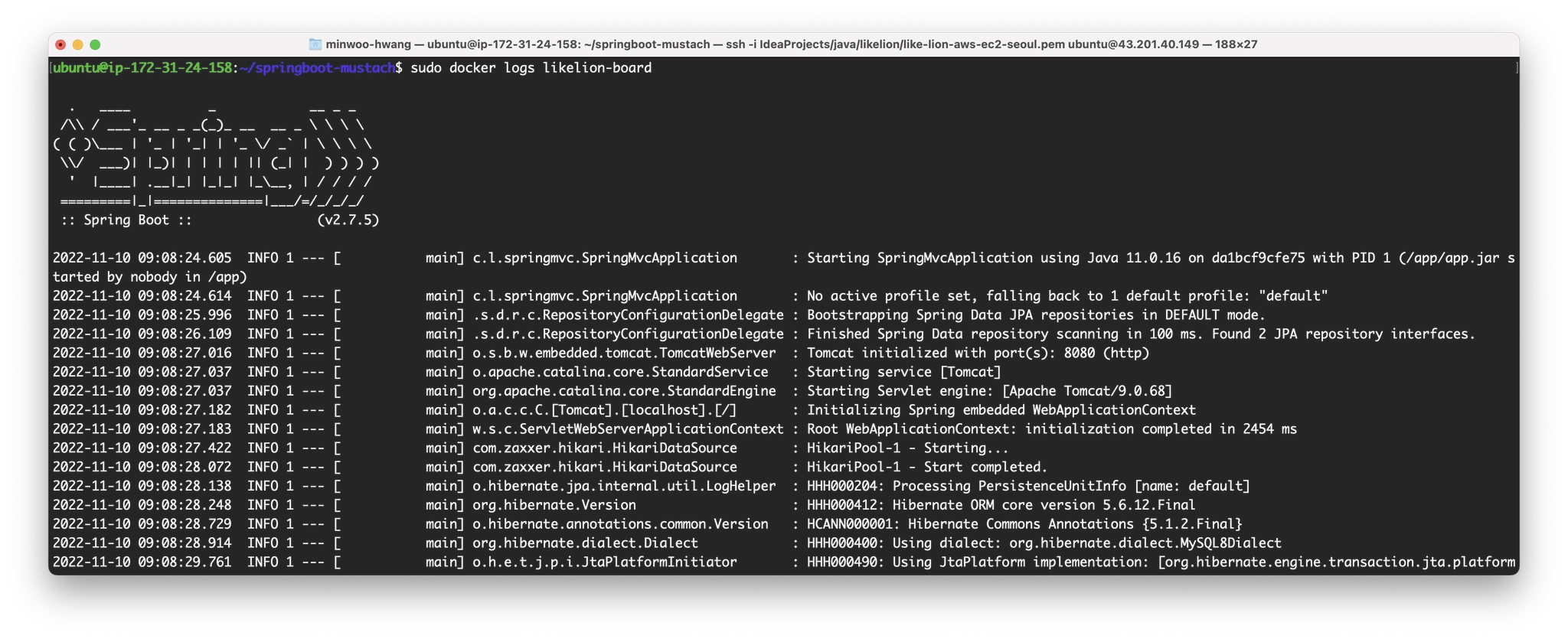sudo docker logs {컨테이너 이름 또는 컨테이너 아이디}