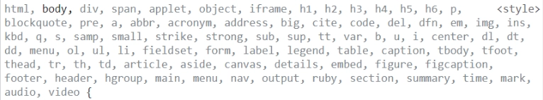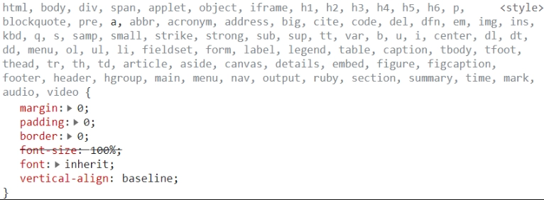 style-rest 패키지를 다운받아서 사용할 수 있는 reset은 에릭 마이어의 Reset CSS를 사용하는데 font 설정이 되어있는 reset css 코드 부분을 살펴보면 a태그는 포함되어 있지만 button 태그는 포함되어 있지 않다. 따라서, a태그는 우선순위로 인해 전체선택자에 있는 font-family가 무시되고 reset css에 있는 font: inherit이 적용된 것이었고, 버튼은 reset css에 포함되어있지 않기 때문에 전체선택자에 있는 font-family가 적용된 것이었다. ㅎㅎㅎ.... 아래 타입 선택자 부분을 보면 button은 포함되어 있지 않다. 한마디로 아래 타입 선택자에 포함된 태그들은 폰트 적용이 안된다는 뜻이다...