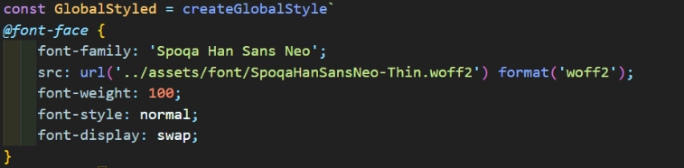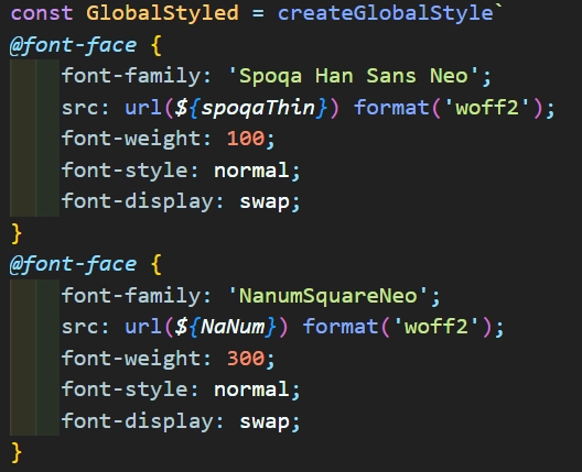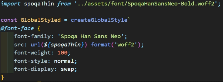 먼저, 폰트 파일의 경로를 직접적으로 url의 인자로 불러오고 있었다. 그러나 리액트에서는 파일(이미지, 폰트)를 이렇게 직접적으로 가져오면 안되고, 따로 import를 해서 가져와야 한다.