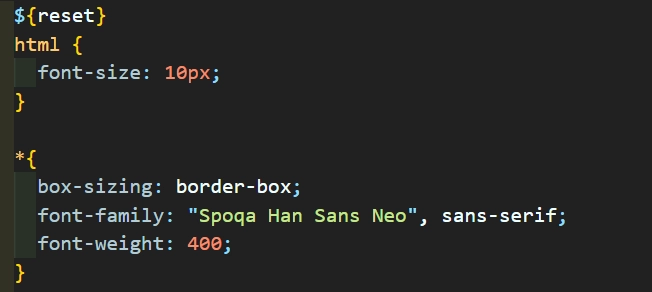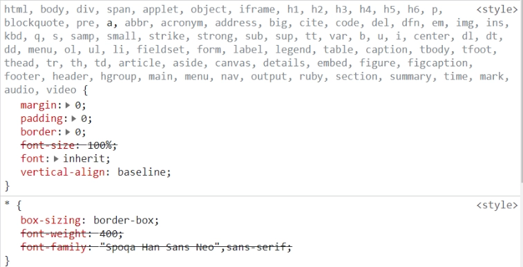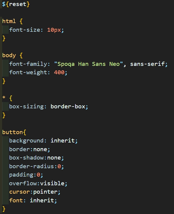 그래서 아래와 같이 코드를 수정했다. 전체 선택자에 있던 font-family와 font-weight을 body로 옮겨 주었다. 이렇게 되면 body태그는 타입 선택자로 가중치 점수가 1점이고, reset css에 포함되어있는 body 태그 역시 가중치 점수가 1점(html, body, div, span... 이런식으로 타입 선택자가 여러개여도 점수는 1점이다.) 이기 때문에 후자 우선의 원칙으로 body태그에는 Spoqa Han Sans Neo가 적용되고, 나머지 태그들은 font: inherit이 적용되게 된다. 따라서, body에 적용된 Spoqa Han Sans Neo를 상속받을 수 있게 되는 것이다. 그리고 button에는 따로 font: inherit을 추가해주어서 상속받을 수 있게 만들었다.