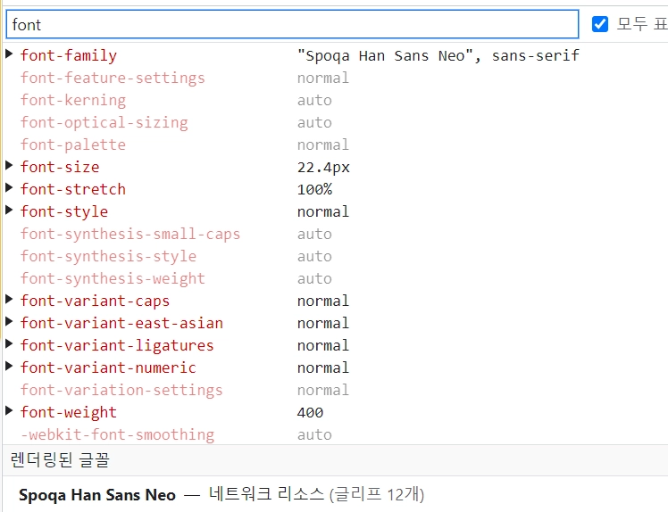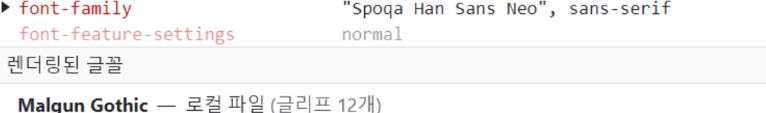 그래서 설마? 하고 이전에 강의를 들을 때 강사님께서 폰트를 적용하고 난 후 개발자도구에서 렌더링된 글꼴을 꼭 확인해야 한다고 하셨던 것이 기억이 나서 확인해보았다. 렌더링된 글꼴은 개발자 도구에서 Computed(계산됨) 탭에서 font 검색 시 확인할 수 있다. 그랬더니 헉..! Spoqa Han SanS Neo가 아닌 윈도우의 기본 글꼴인 맑은 고딕이 적용되고 있었다.
