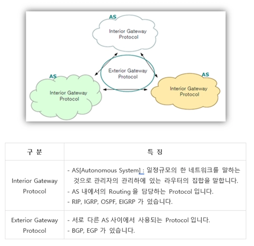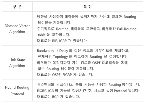 정보갱신 방식, 내/외부 프로토콜, 테이블 관리 에 따라 구분된다.