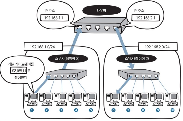 네트워크를 분할한 다음, 한 컴퓨터가 다른 네트워크에 있는 컴퓨터에 데이터를 전송하려면, 라우터의 IP 주소를 설정해야 한다. 이것은 네트워크의 출입구를 설정하는 것으로 기본 게이트웨이라고 한다.