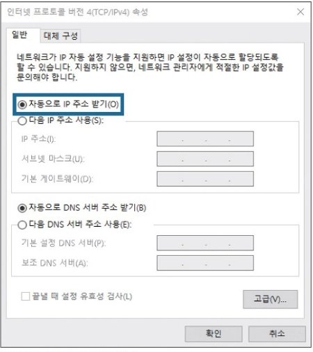 이런 IP주소는 윈도 10의 네트워크 설정화면에서 자동으로 IP주소 받기 에 체크되어 있으면 네트워크 외부에 접속할 때 사용되는 기본 게이트웨이가 자동으로 설정된다.