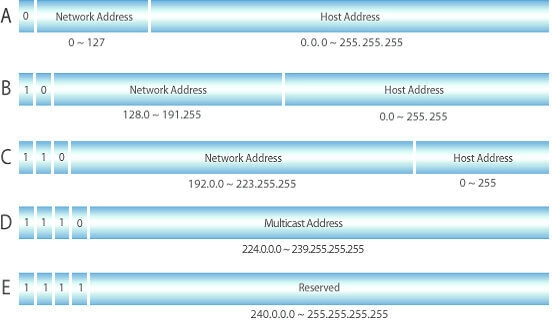 위와 같이 클래스 별로 맨 처음 옥텟의 몇개가 고정값으로 되어 있어서 A : 0~127 / B : 128~191 / C: 192~223 / D : 224~239 / E : 240~255 로 0~255의 첫 옥텟 값에 따라 네트워크를 나누고 시작한다. → 클래스는 맨 처음 옥텟의 값으로 구별할 수 있다.