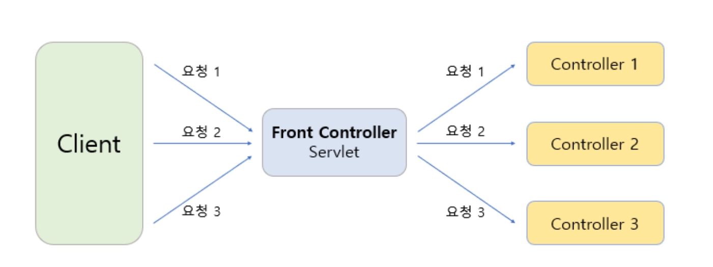 하나의 servlet에서 요청을 받아들여 적절한 controller로 요청을 위임한다