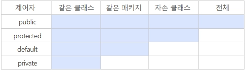 접근제어자가 사용될 수 있는 곳 : 클래스, 멤버변수, 메서드, 생성자