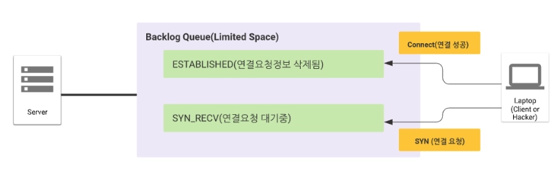 하지만, 연결이 정상적으로 진행되지 않는 경우 SYN_RECV 상태로 계속 쌓여있게 되고, 공간이 가득 차게 되면 다른 연결 요청 정보 저장이 불가능해진다.