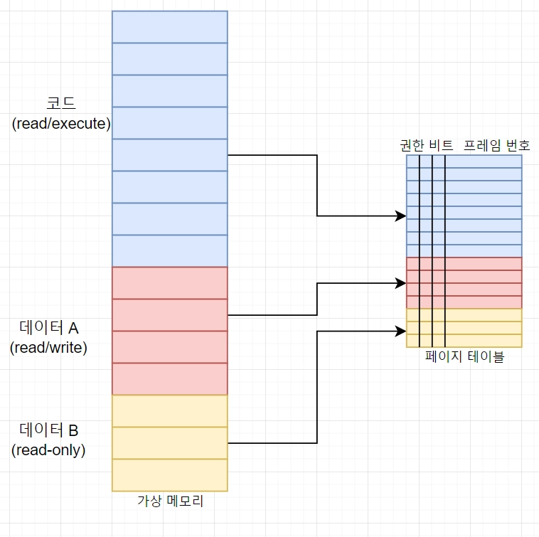 메모리 관리자는 주소 변환이 이루어질 때마다 테이블의 권한 비트를 이용하여 유용한 접근인지 아닌지 확인한다. 만약 읽기만 가능한 메모리 영역에 쓰기를 하려고 하면 메모리 오류인 트랩이 발생한다.