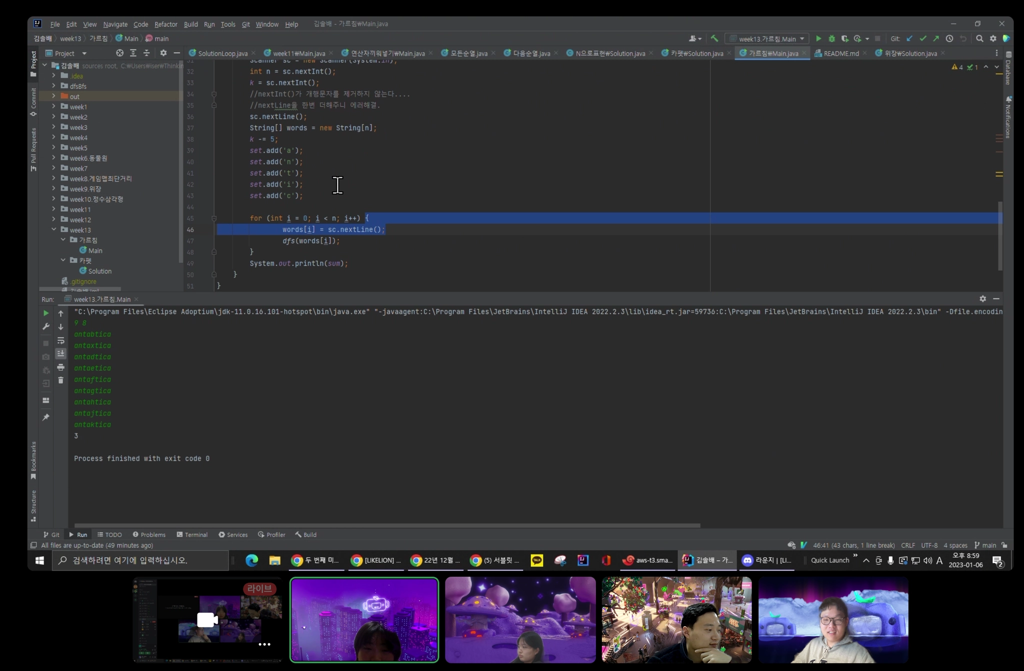 모든 단어에서 쓰인 알파벳 중에서 K-5개를 뽑아 combination을 돌린 후 포함 여부를 보고 개수를 센 다음 가장 최대인 개수를 세는 로직이다. 하지만 시간 초과가 났다. 아예 다른 방법으로 접근해야 할 지 고민이 되는데, 좀 더 고민해봐야 할 것 같다.