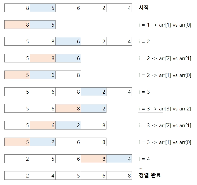 어느 위치에 들어가야 하는지 결정하기 때문에 삽입(Insertion) 정렬이라고 한다.