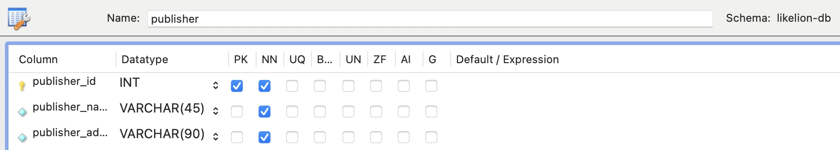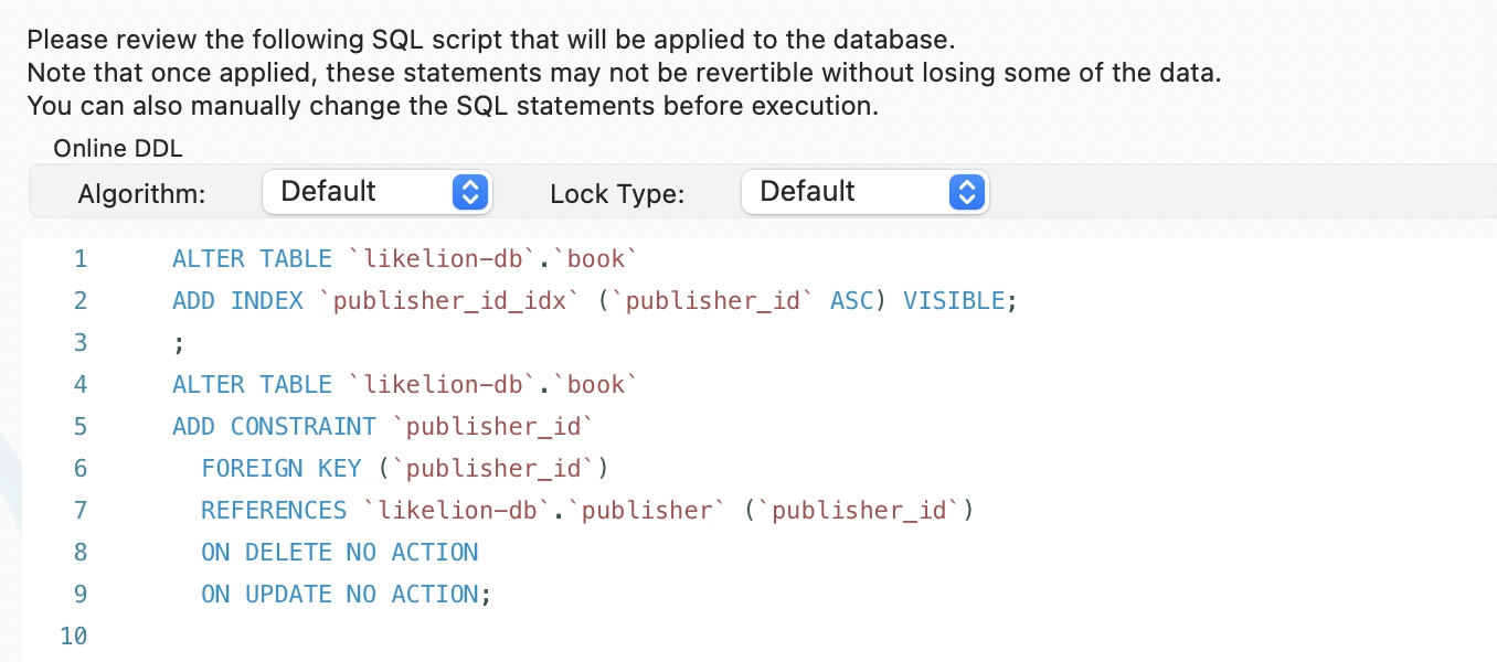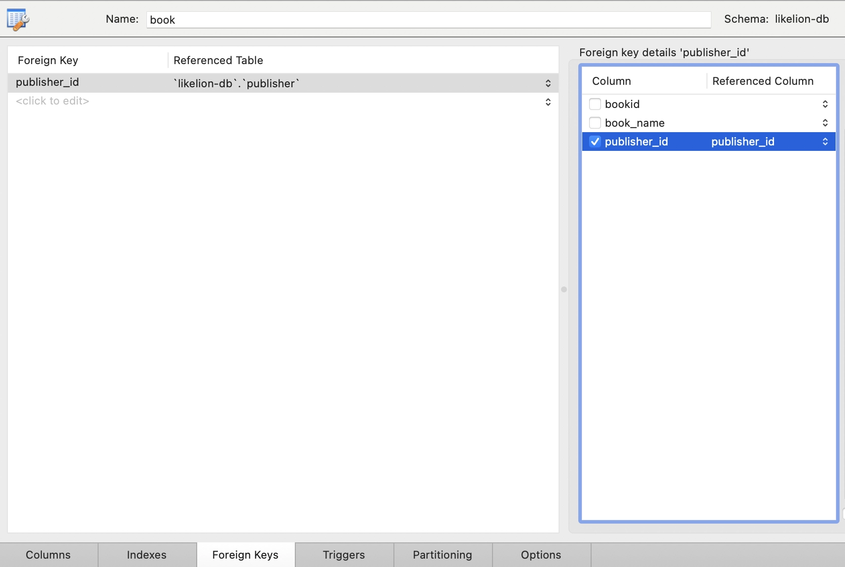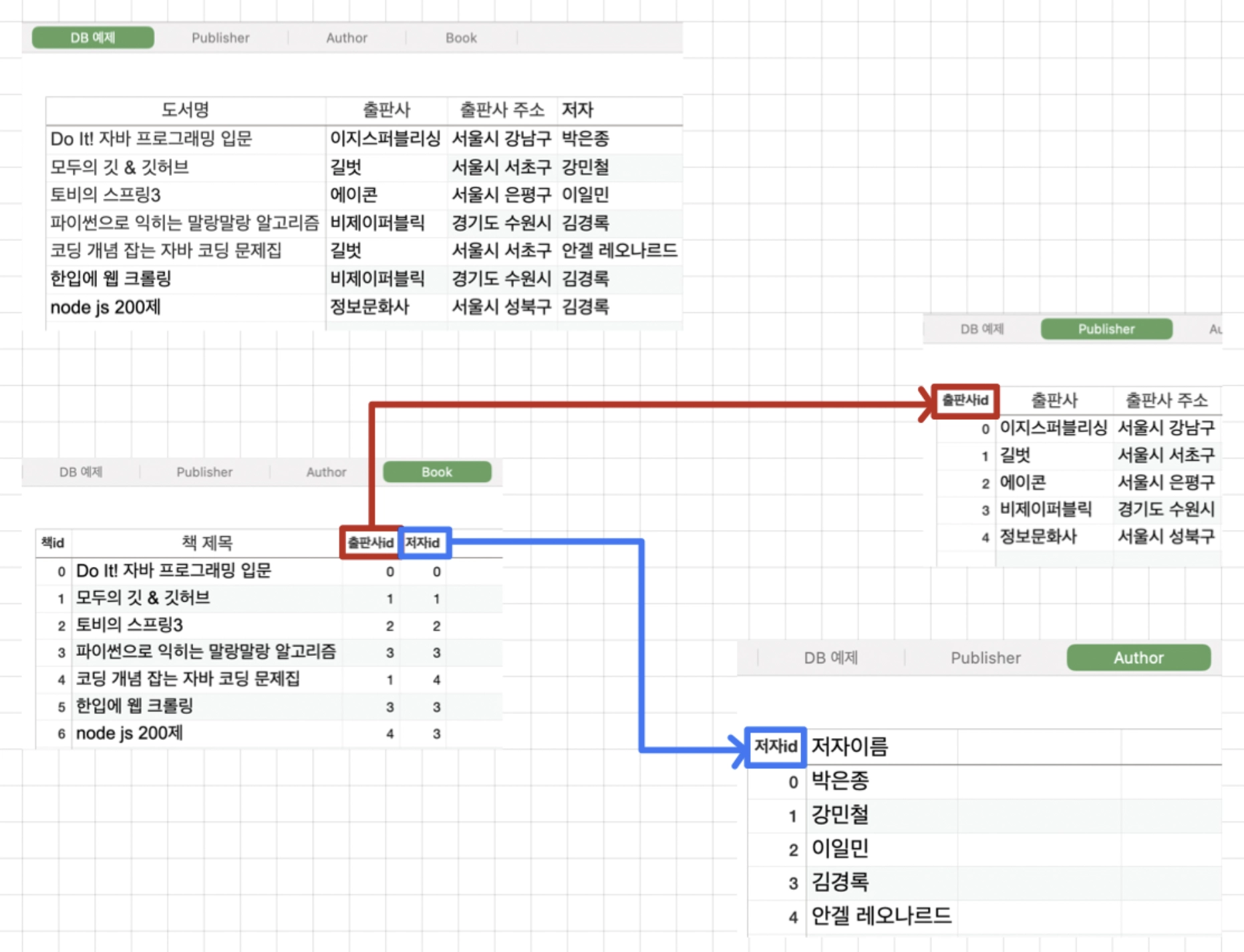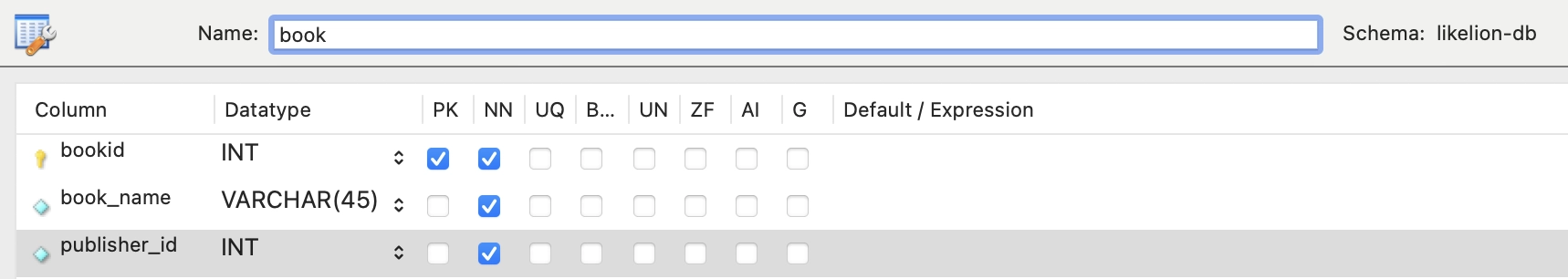 book Table 에 publisher Table 의 publisher_id 를 외래키로 걸기 example