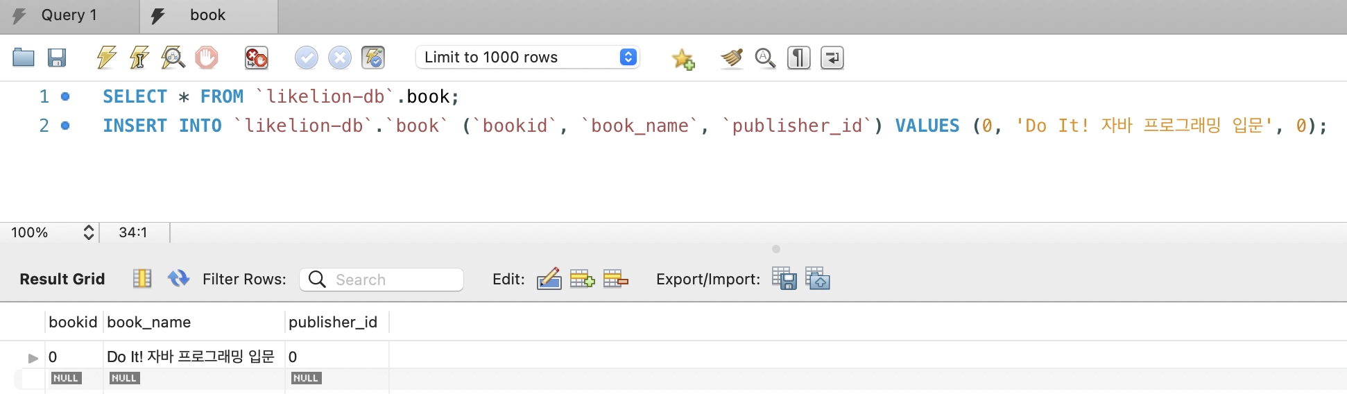 INSERT INTO `likelion-db`.`book` (`bookid`, `book_name`, `publisher_id`) VALUES (5, 'Do It! 자바 프로그래밍 입문2', 5);