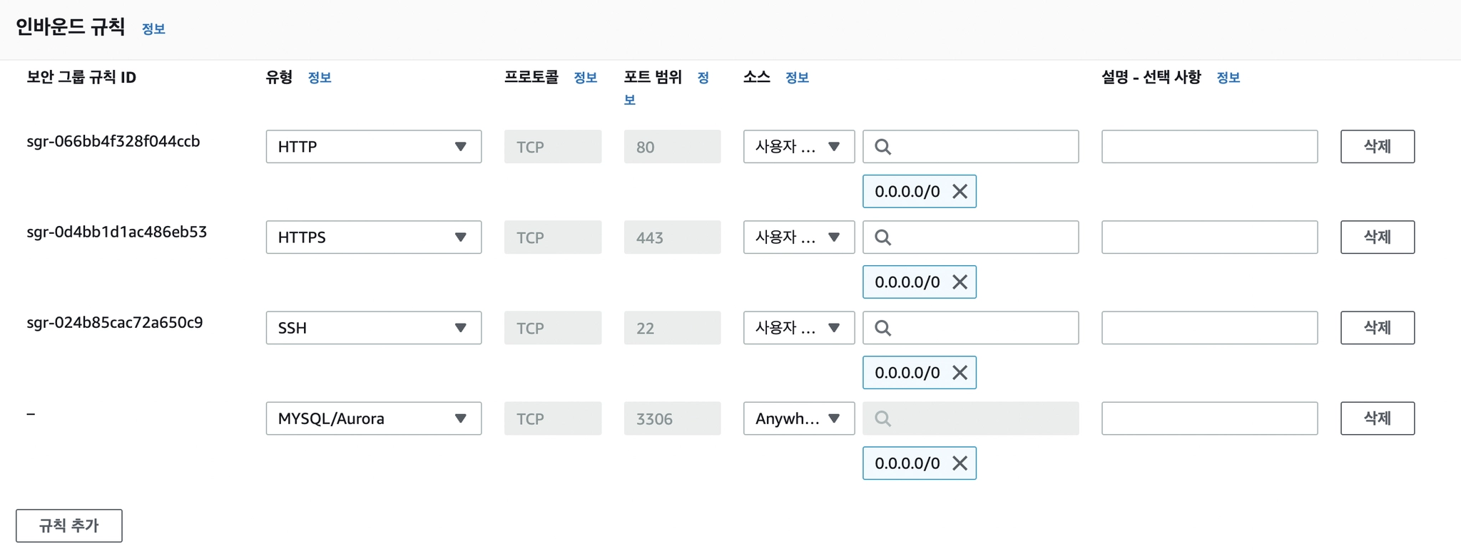 규칙을 추가한다. (MYSQL/Aurora, 3306 포트, 0.0.0.0/0 - 모두에게 열기)