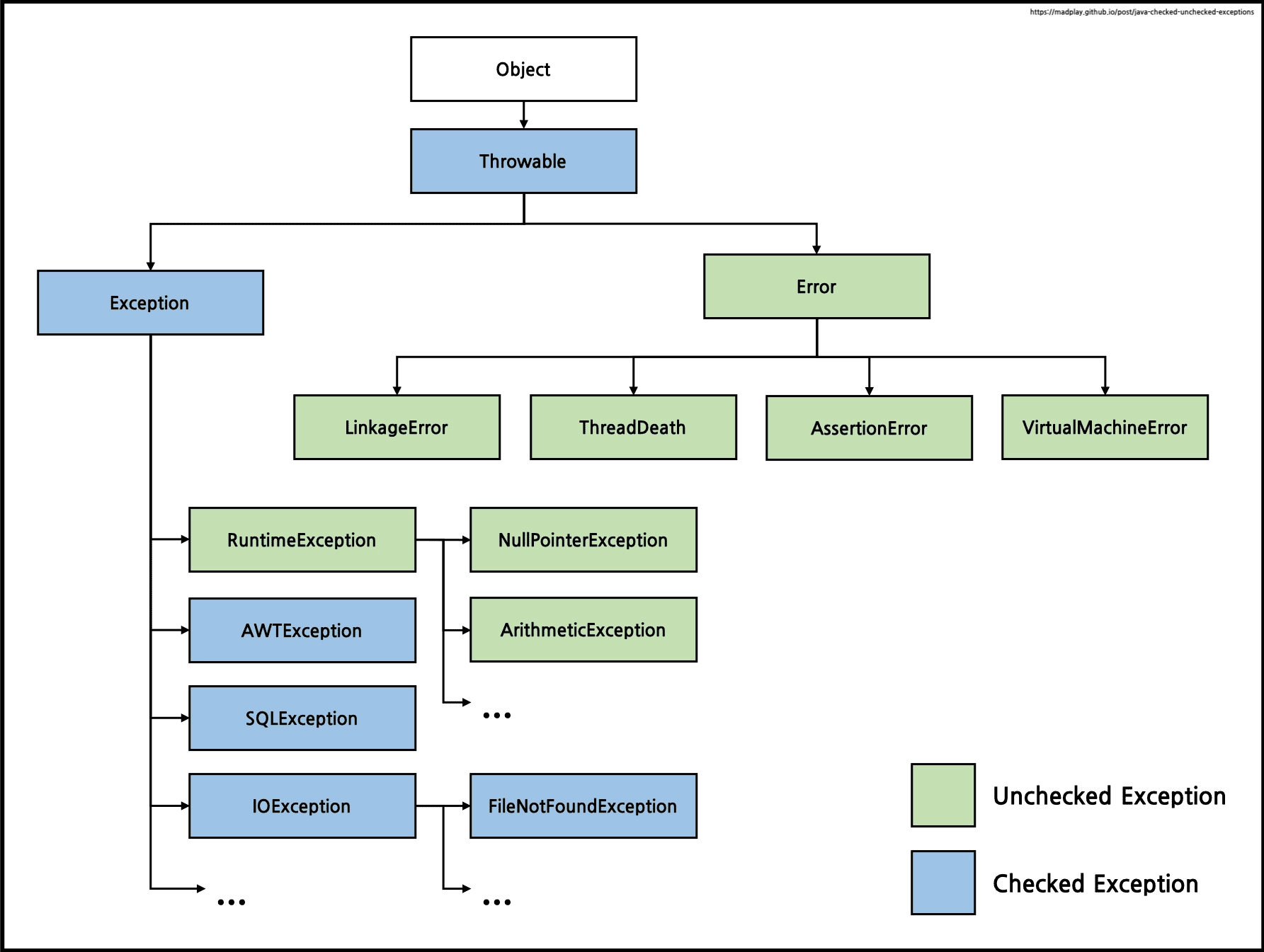 오류와 예외 모두 Object 클래스를 상속 받는 Throwable 클래스를 상속.