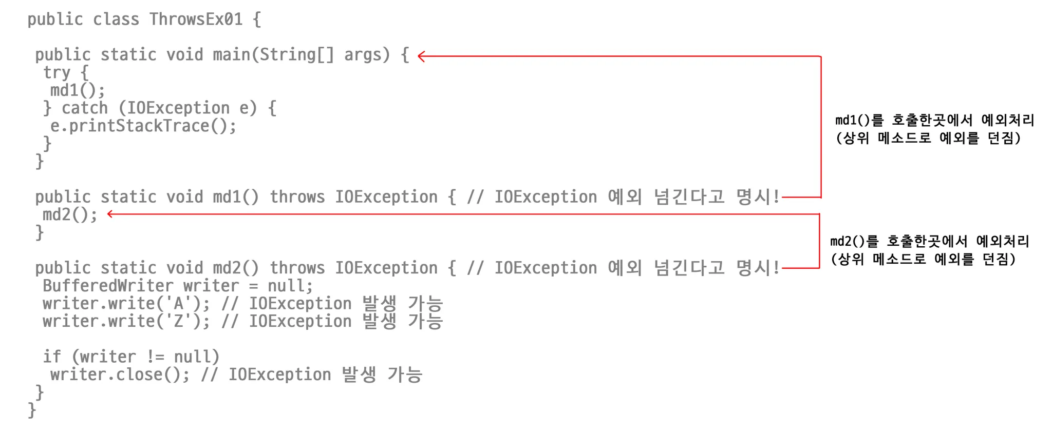 자신을 호출하는 메소드의 예외처리의 책임을 넘기는 것. (상위 메소드로 예외를 던짐)