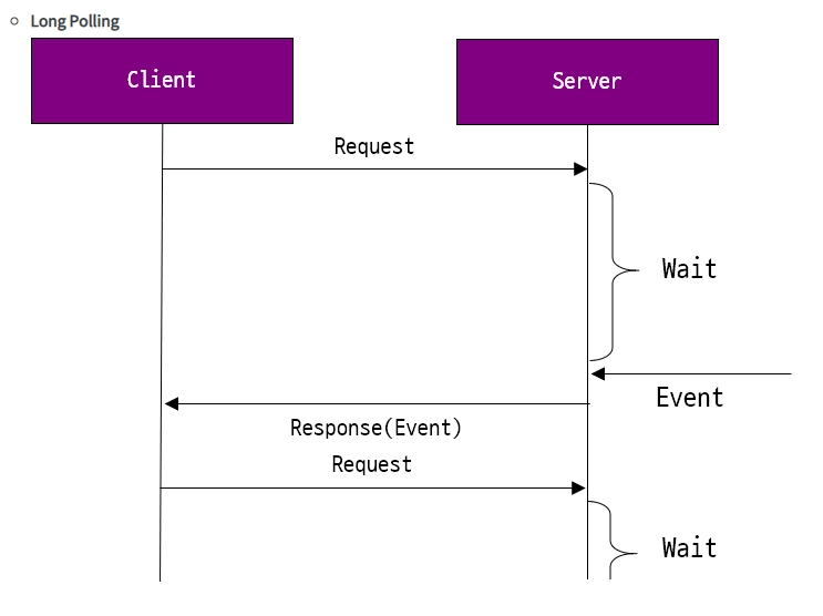클라이언트에서 서버로 Request를 보내고 기다리다가 서버에서 해당 클라이언트로 전달할 이벤트가 있다면 그 순간 Response 메세지를 전달하며 연결이 종료