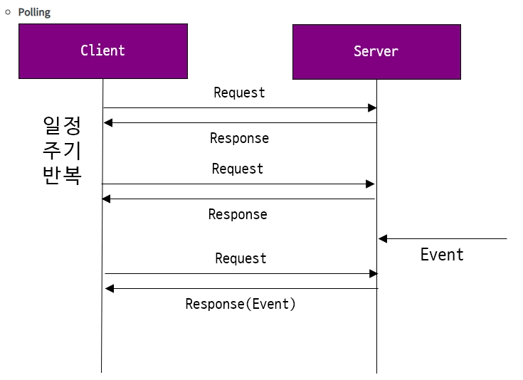 Polling방식은 언제 통신이 발생할 지 예측이 불가능하기 때문에 클라이언트가 평범한 http request를 일정한 주기로 서버에 요청하여 이벤트 내용을 전달받는 가장 간단한 방법