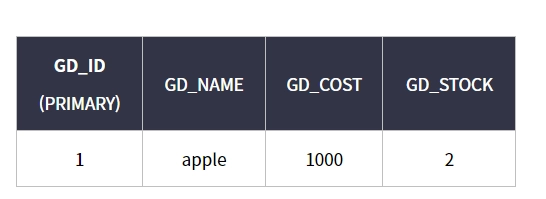 | GD_ID | GD_NAME | GD_COST | GD_STOCK |
