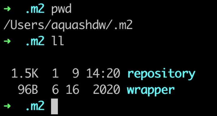여기서 추가하게 되는 의존성은, 실제로 프로젝트를 진행하는 컴퓨터에 물리적 파일로 존재합니다. macos 기준으로, $HOME 환경변수에 저장된 폴더의 .m2 라는 숨겨진 폴더에 존재합니다. 햇갈리면, 터미널을 열고 cd .m2 를 하면 확인할 수 있습니다.