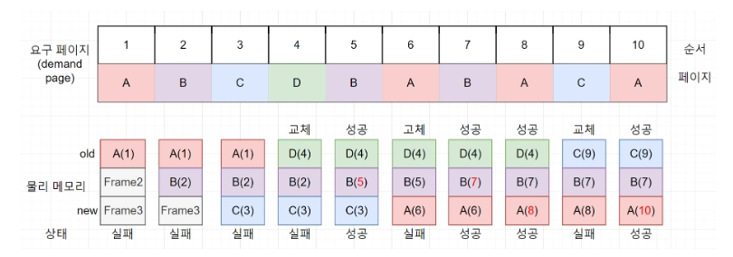 숫자가 가장 작은 페이지, 즉 사용된 지 가장 오래된 페이지를 대상 페이지로 선정한다.