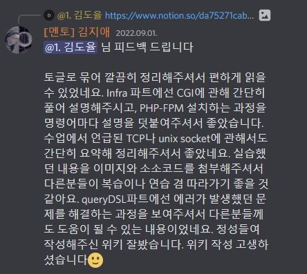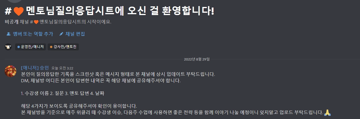 DM도 괜찮으나, 모든 수강생이 공통적으로 궁금해 할 만한 질문이면 디스코드 채널방에 한 번 더 공지해주는 것을 권장드립니다.