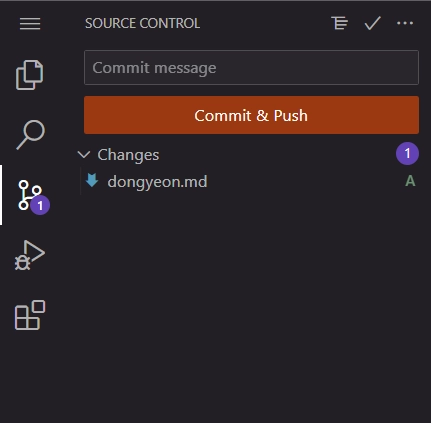 2) 파일을 생성하면 왼쪽 source control에 아래와 변경파일이 표시됩니다. commit message에 Docs : Create dongyeon.md 와 같이 커밋 메시지를 입력하고 commit & push 버튼을 눌러주세요. (커밋 메시지 가이드는 본 페이지 하단에 있습니다. )