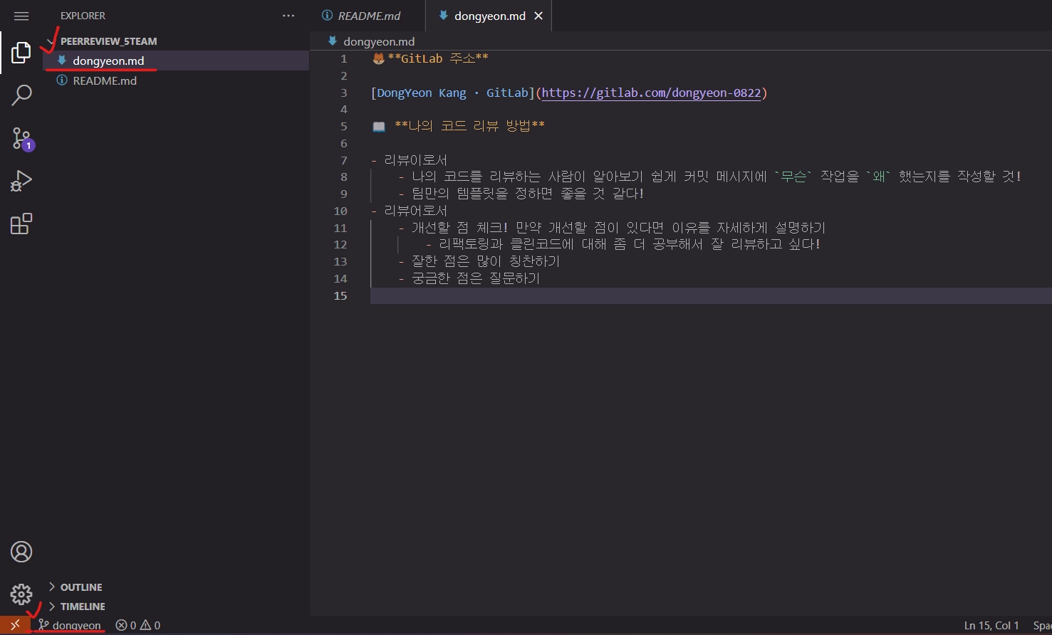 1) 아래와 같이 왼쪽 하단에 브랜치명이 자신의 브랜치 인지 확인하고, 자신의 이름.md 의 마크다운 파일을 생성하고 위에 자신의 코드 리뷰 스타일 적은 것을 복사해주세요.