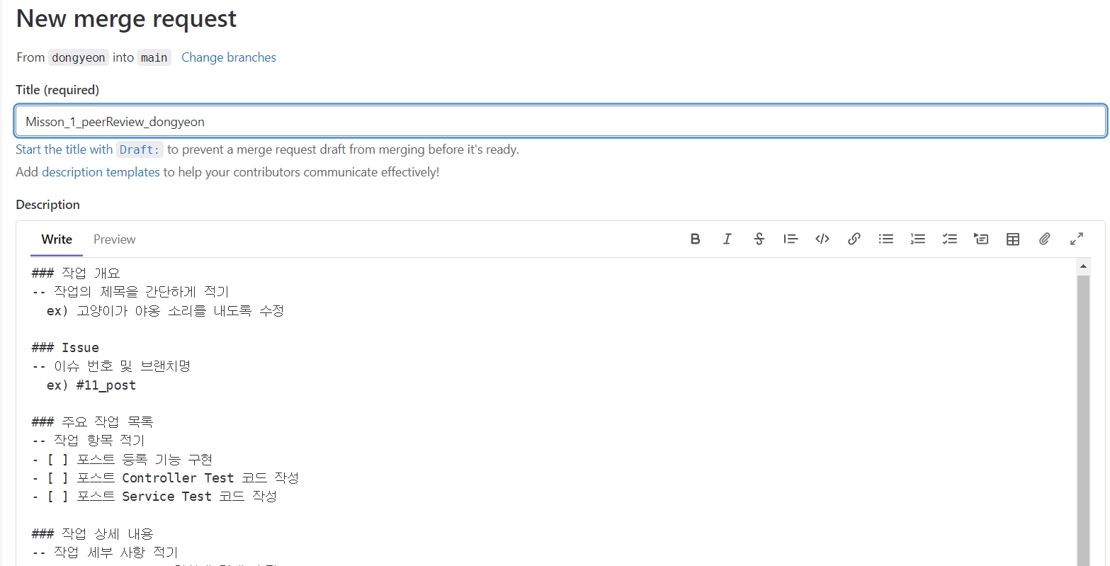 다음과 같이 제목은 Mission_1_peerReview_브랜치이름 으로 하고, 하단의 Pull Request Template을 복사하여 리뷰어가 자신의 코드를 잘 이해할 수 있게 내용을 자세하게 작성해주세요!