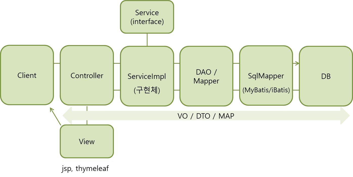 Service가 비즈니스 로직을 수행하고 데이터베이스에 접근하는 DAO를 이용해서 결과 값을 받아온다.