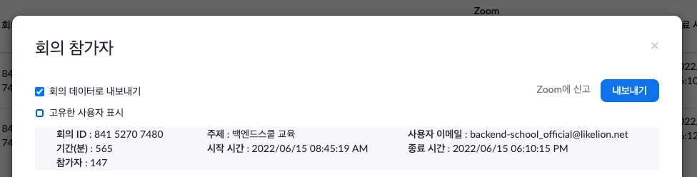 5. 회의 데이터로 내보내기 체크 > 내보내기 클릭
