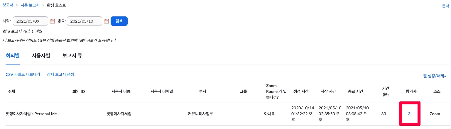 4. 시작 / 종료 날짜 입력 후 검색 > 참가자 숫자 클릭