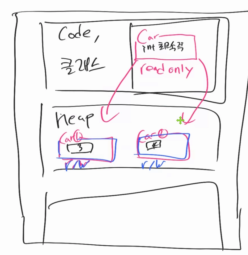 new로 코드 영역의 원본(클래스)을 복사하여 복사본(객체)를 만든다.