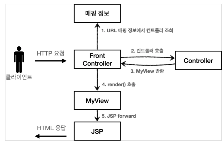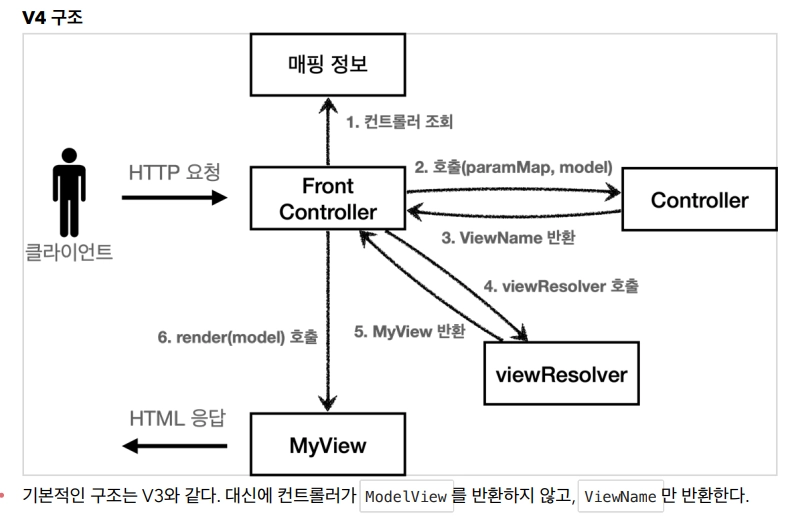 이제 각 컨트롤러는 복잡한 dispatcher.forward() 를 직접 생성해서 호출하지 않아도 된다. 단순히 MyView 객체를 생성하고 거기에 뷰 이름만 넣고 반환하면 된다.