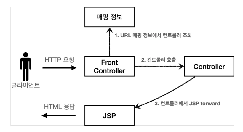 공통로직을 FrontController(서블릿 역할)로 처리하고 하나의 서블릿으로 Cilent와 소통한다.