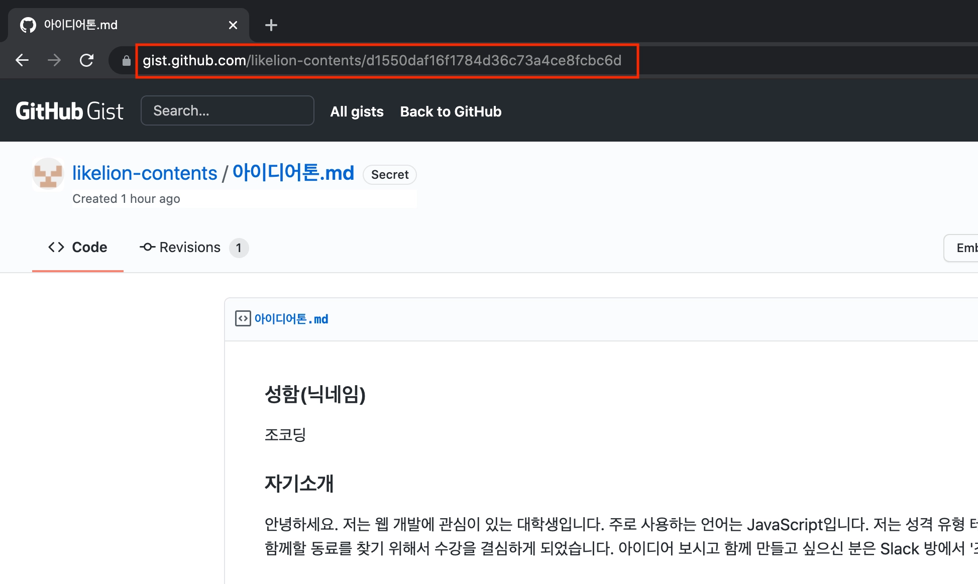 URL: 3번 단계에서 복사한 Gist URL을 입력해주세요.