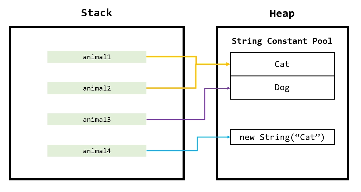 위와 같이 String을 리터럴로 할당하는 경우 animal1 , animal2 , animal3 는 Stack 영역에, "Cat" 과 "Dog" 는 Heap 영역에 저장된다.