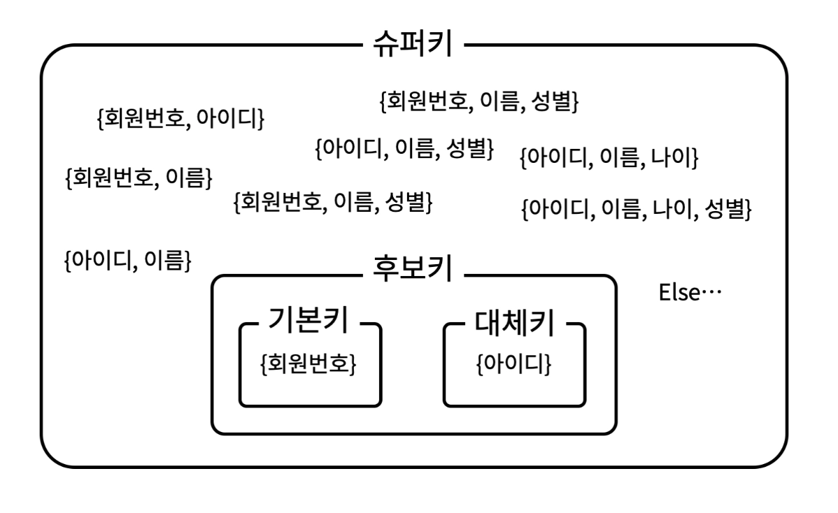위 릴레이션에서 회원번호를 기본키로 정했다면, 아이디는 대체키가 된다.