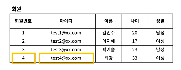 위 테이블에서는 {회원번호}, {아이디} 가 단일속성 슈퍼키이다.