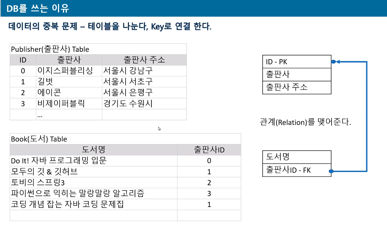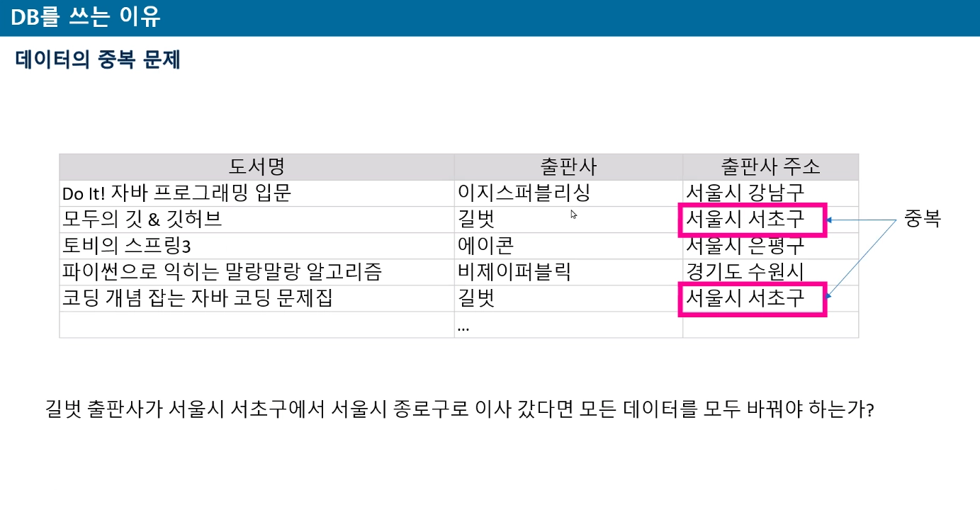 여러 개를 고칠 필요 없이, 테이블을 나눌 경우, Publisher 테이블의 출판사 주소만 바꾸면 된다.
