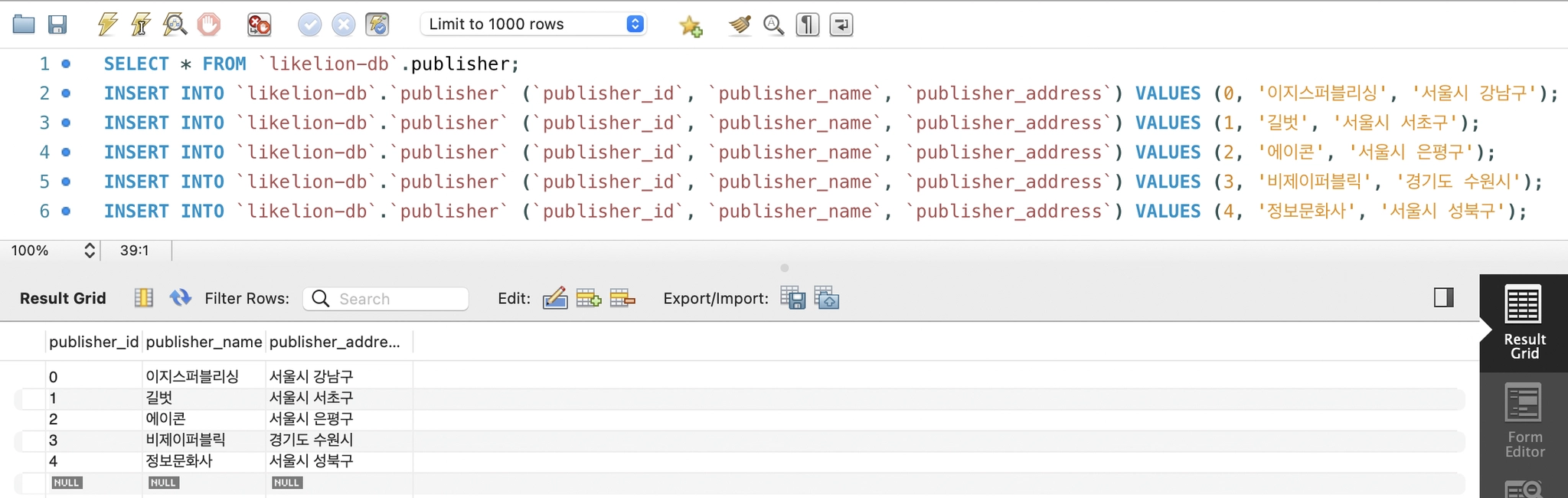 그래서 book Table에 INSERT INTO `likelion-db`.`book` (`bookid`, `book_name`, `publisher_id`) VALUES (1, 'Do It! 자바 프로그래밍 입문2', 1); 을 또 Insert 할 경우 1번을 이미 앞에서 쓰고 있기 때문에 Duplicate entry 에러가 난다.