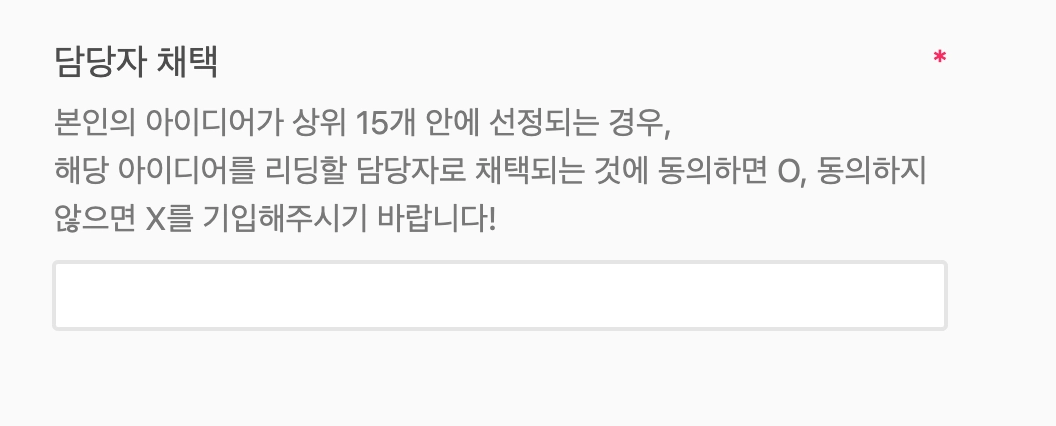A1. 아이디어 취합 당시, 여러분은 아래와 같이 담당자 채택이라는 항목에 동의여부를 기재하신 것으로 알고있습니다. 해당 항목에 동의하신 경우, 본인의 아이디어를 리딩하는 것으로 간주하여 다른 팀으로는 매칭이 불가하다는 점 인지 부탁드립니다.