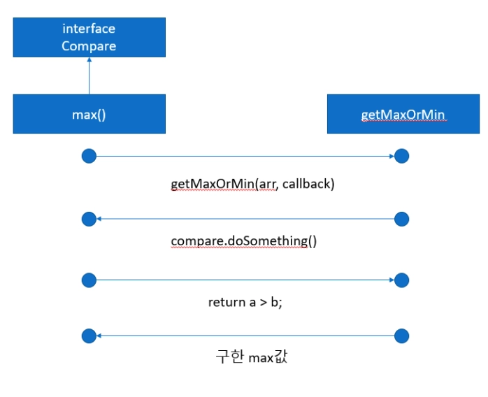 CallBack 작동 방식을 사용하여 main에서 max함수를 호출하고, getMaxOrMin함수를 호출하게된다. 하지만 호출할 때에는 Compare 인터페이스를 구현해주는 구현체를 함께 넘겨서 getMaxOrMin함수에서 compare메서드를 호출하게 될 때 해당 넘어온 호출함수로 다시 돌아가서 해당 메서드를 실행하게 된다.
