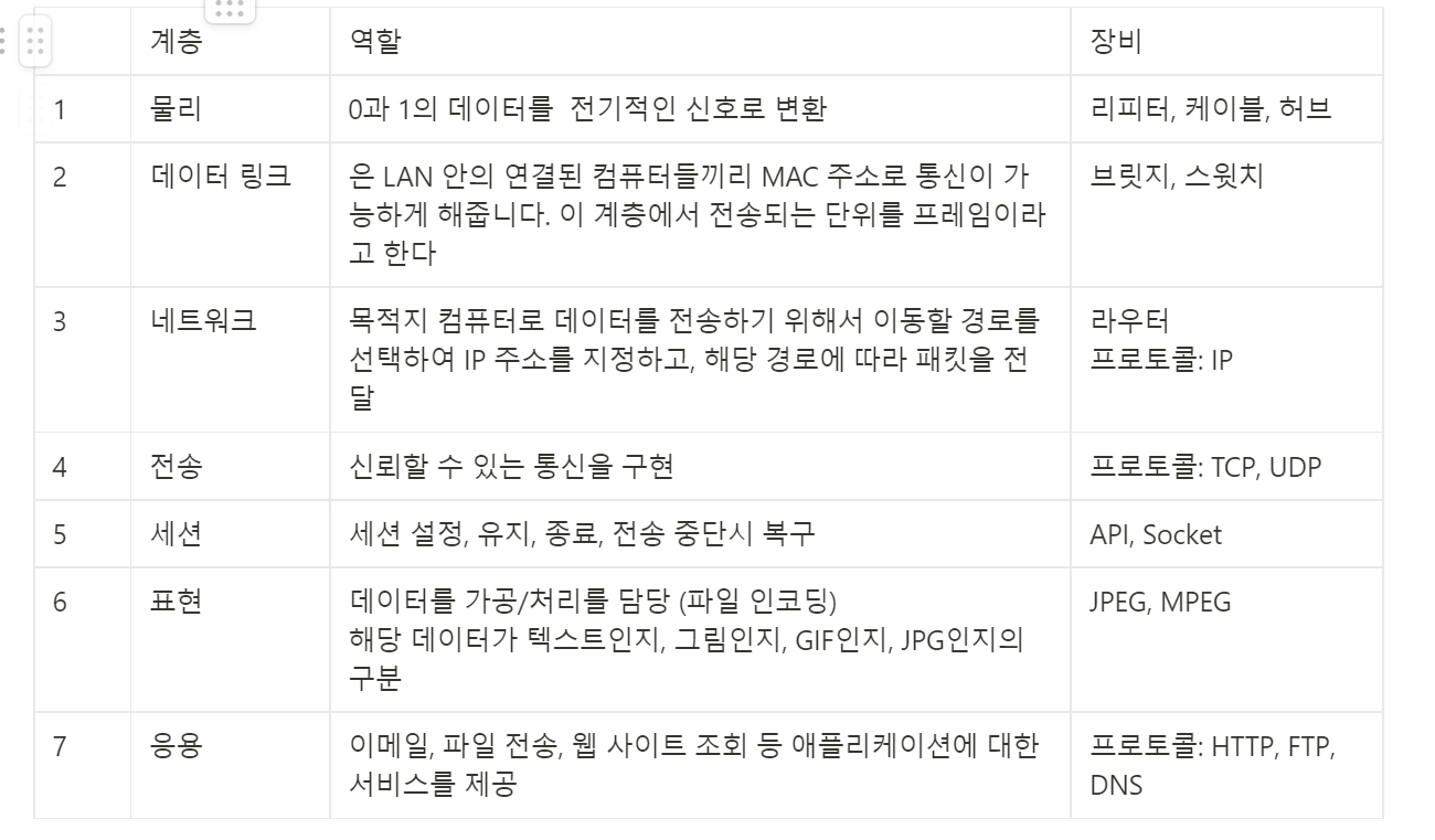 컴퓨터에서 데이터를 전송하기 위해서 컴퓨터 내부에서 하는 여러 가지 일들을 7 계층으로 나눈 것