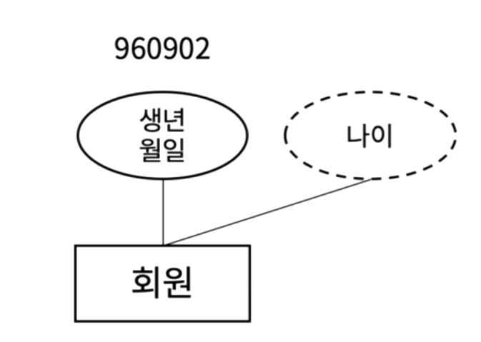 생년월일 데이터로 부터 [나이] 를 유도해서 데이터를 얻을 수 있는데, 이러한 경우 처럼 메모리에 저장하지 않고도, 기존에 있던 속성으로 얻을 수 있는 속성을 유도된 속성이라고 한다.