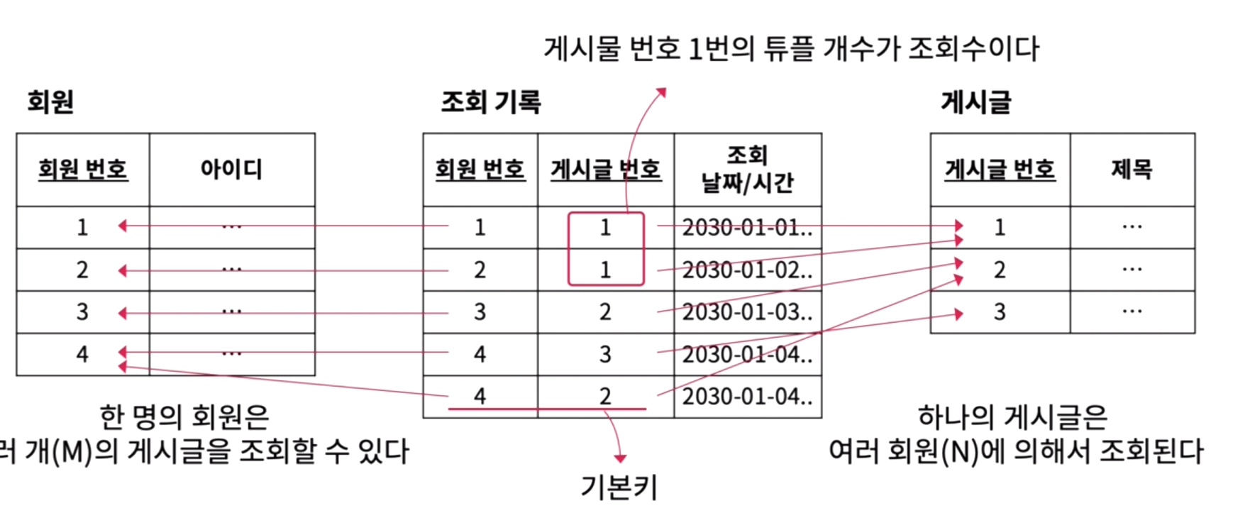 작성 관점에서는 카디날리티가 1:N 이었지만, 조회 관계에서는 N:N 카디날리티를 갖는다.