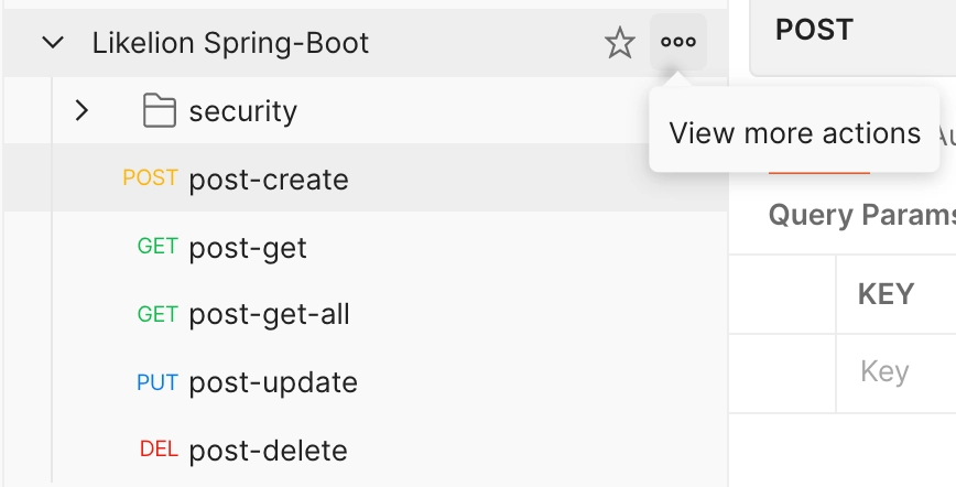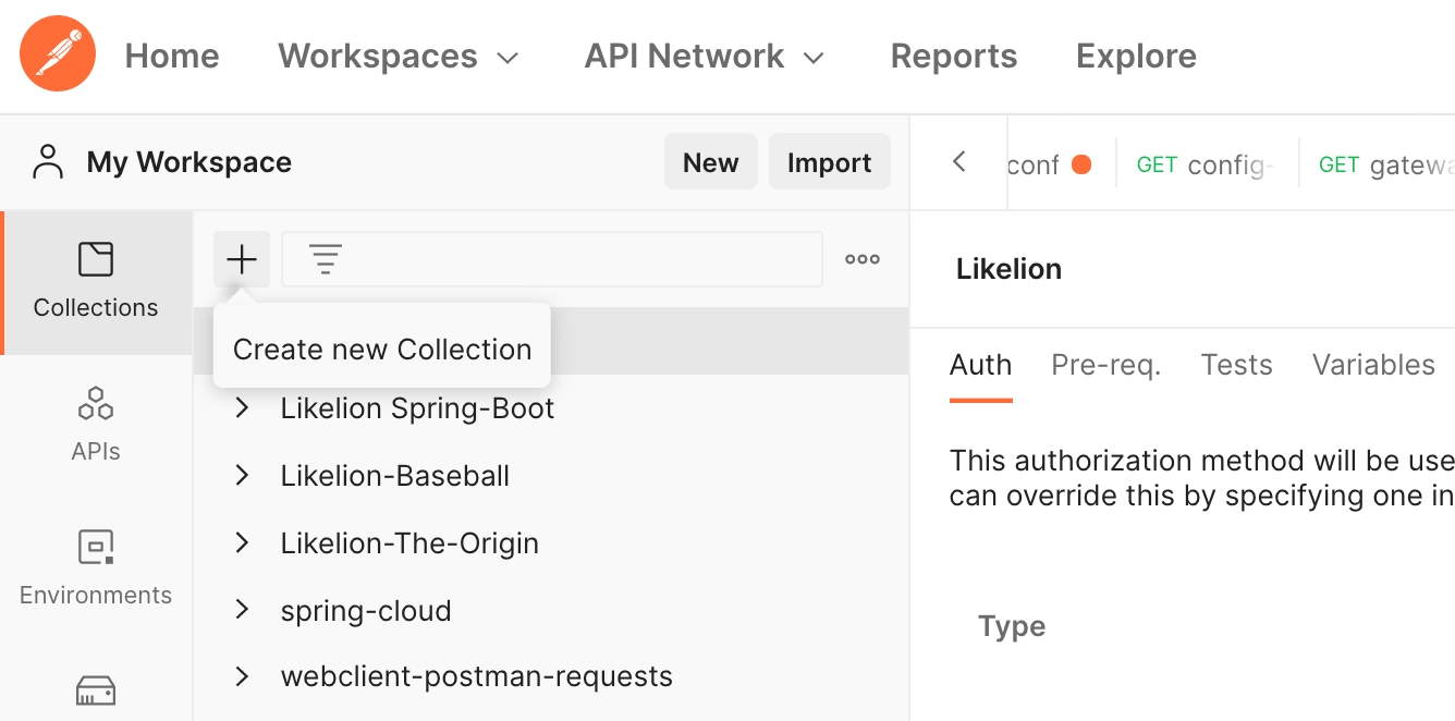 기본적인 화면에서 그림에 보이는 + 버튼을 누르게 되면 Collection을 생성하게 됩니다. 개인적인 제안으로는 하나의 프로젝트에 대하여 Collection을 하나 만드는 것입니다. Collection을 기준으로 요청을 생성하게 되면 해당 프로젝트의 기능을 한곳에서 관리할 수 있으며, 후에 보안 / 인증 설정들을 공유하기 편하기 때문입니다.