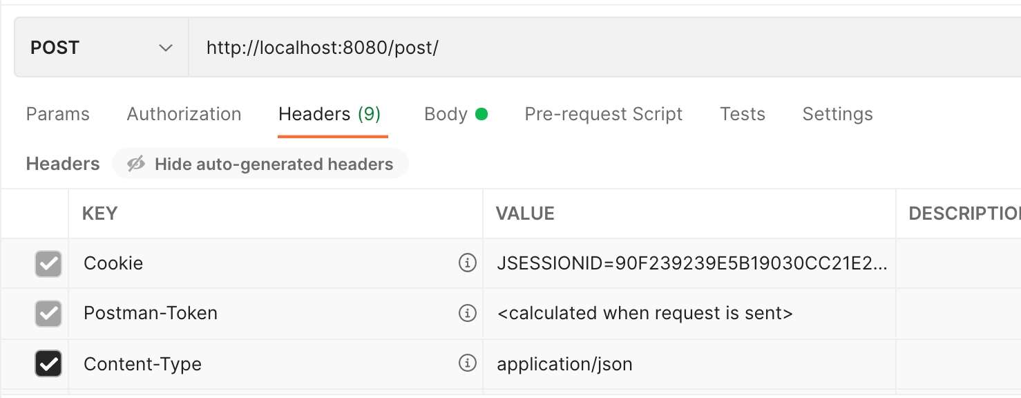 Header 항목이며, 이미 존재하는 Header도 있고, 수동으로 추가할 수도 있습니다. 여기에 더해 앞서 Body에서 선택한 데이터형에 따라 Content-Type Header는 자동으로 추가됩니다.